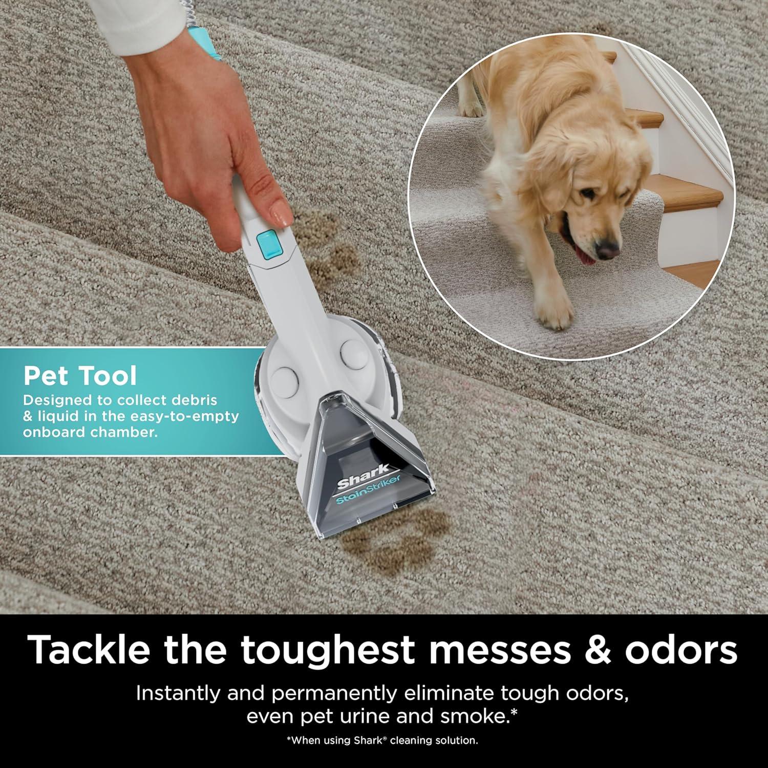 Shark StainStriker is a portable carpet and upholstery cleaner that combines dual-activated formula and ultra-powerful suction to remove embedded spots and stains – perfect for pets, car interiors, and whole-home cleaning.